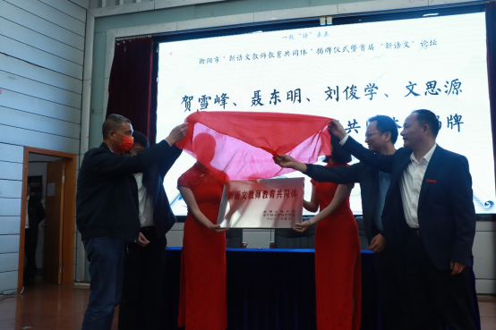 衡阳市教育局副局长贺雪峰、衡阳388vip太阳集团副校长聂东明、衡阳388vip太阳集团副校长刘俊学、衡阳市八中校长文思源为“新语文教师教育共同体”揭牌。